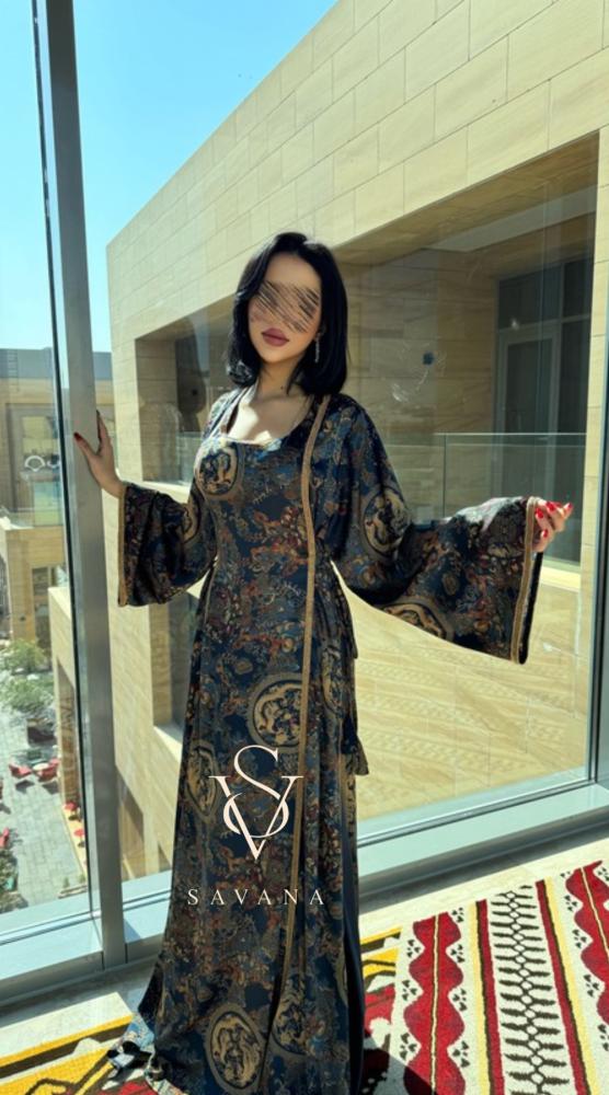 جلابية من قماش ستان حرير ناعم ولامع، بتصميم مشجر أنيق تضفي لمسة أنثوية وجذابة. تأتي بأكمام طويلة تضيف مزيداً من الرقي، مع قصة انسيابية تمنح راحة وأناقة في نفس الوقت من سافانا